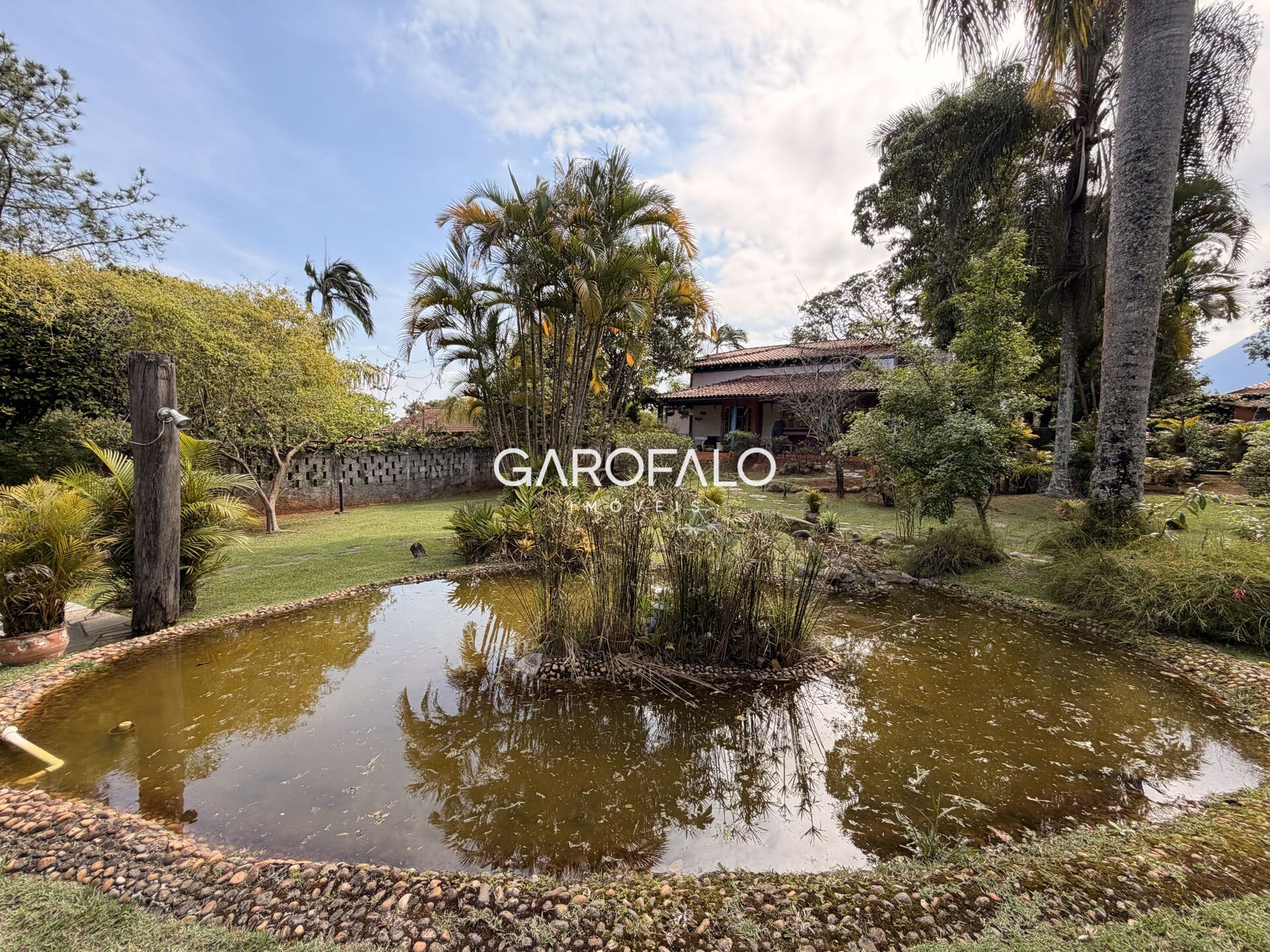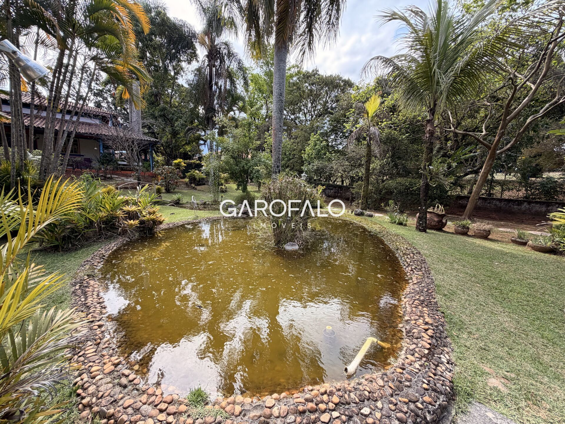 • Lago ornamental com ilhota iluminada e espaço para horta